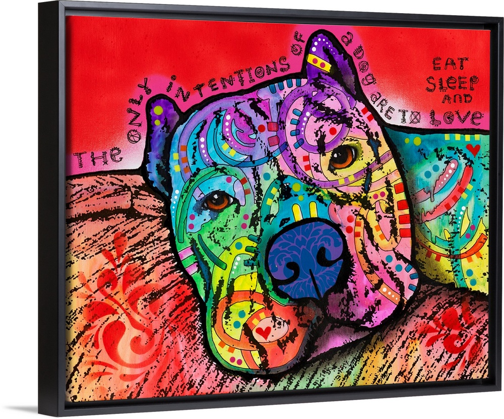 <p>"The Only Intentions of a Dog Are to Eat Sleep and Love" handwritten around a colorful painting of a dog with abstract designs.</p>