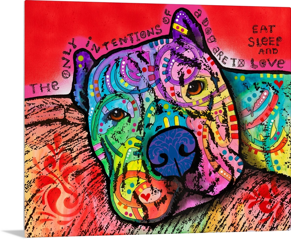 <p>"The Only Intentions of a Dog Are to Eat Sleep and Love" handwritten around a colorful painting of a dog with abstract designs.</p>