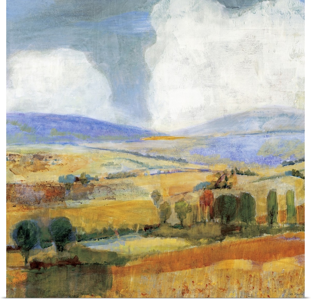 <p>Square contemporary painting of a golden countryside of rolling hills and trees beneath a sky with large fluffy clouds.</p>
