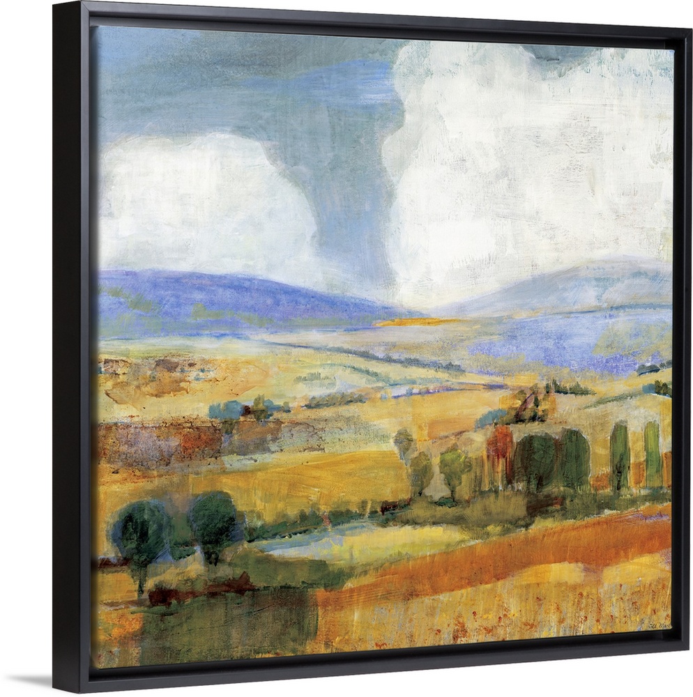 <p>Square contemporary painting of a golden countryside of rolling hills and trees beneath a sky with large fluffy clouds.</p>