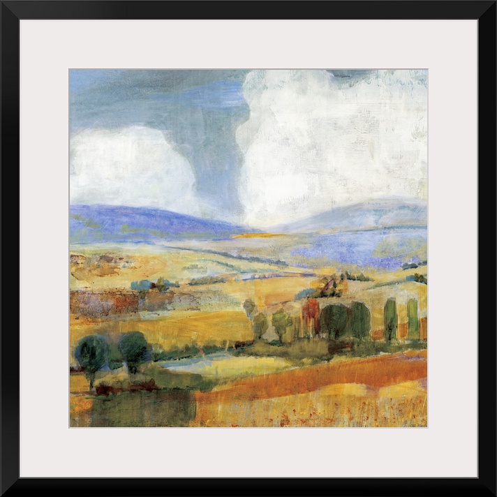 <p>Square contemporary painting of a golden countryside of rolling hills and trees beneath a sky with large fluffy clouds.</p>