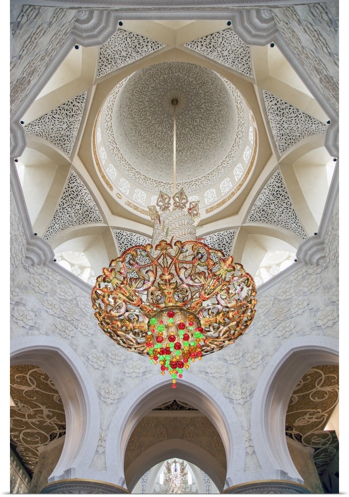 <p>Interior architectural detail and chandeliers of the prayer hall in the the Sheikh Zayed Mosque, Al Maqta district of Abu Dhabi, Abu Dhabi, United Arab Emirates.</p>