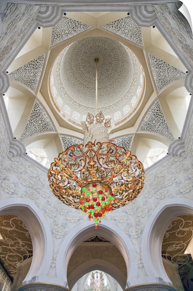 <p>Interior architectural detail and chandeliers of the prayer hall in the the Sheikh Zayed Mosque, Al Maqta district of Abu Dhabi, Abu Dhabi, United Arab Emirates.</p>