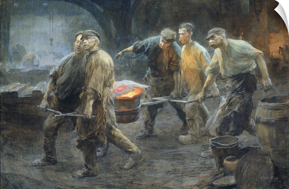 <p>Interior of an Iron Foundry, by Pieter de Josselin de Jong, 1880-1900, Dutch watercolor painting. Five workers carry a crucible of glowing molten metal.</p>