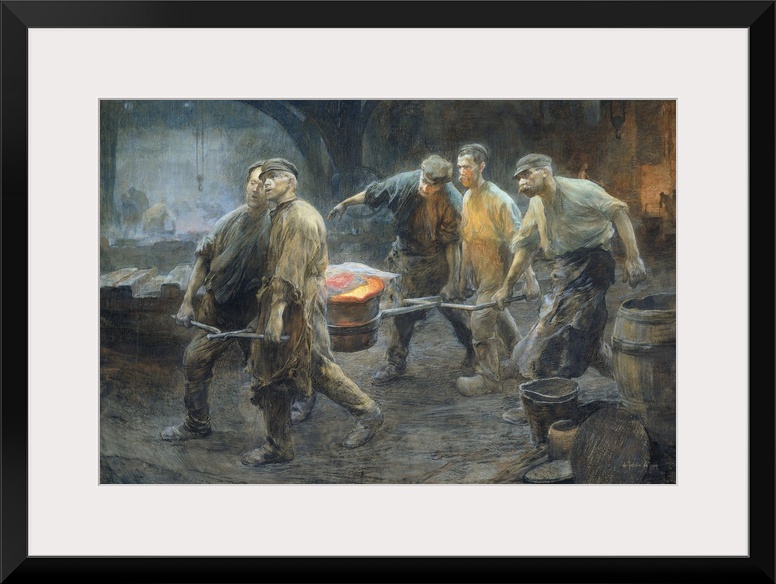 <p>Interior of an Iron Foundry, by Pieter de Josselin de Jong, 1880-1900, Dutch watercolor painting. Five workers carry a crucible of glowing molten metal.</p>