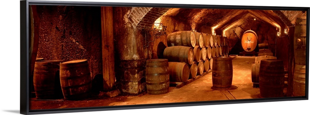 <p>Panoramic photograph shows a group of barrels filled with fermented grape juice as they sit within an underground room in California.</p>