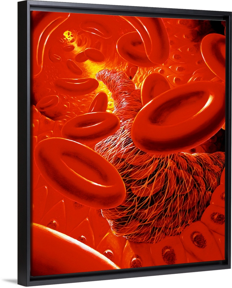 <p>Illustration of the interior of a human blood vessel, showing a snake-like thrombus (blood clot) forming along the length of the vessel. The large saucer-like discs are red blood cells (erythrocytes) that function in the transport of oxygen from the lungs to the tissues (and waste carbon dioxide in the opposite direction). Mature red cells have no nucleus</p>