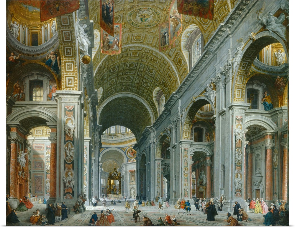 <p>Interior of Paint Peter's, Rome, by Giovanni Paolo Panini, 1754, Italian painting, oil on canvas. Panini painted at least six version of the Interior of Paint Peter's. His works of Roman monuments were popular with aristocratic Europeans on their 'Grand T</p>