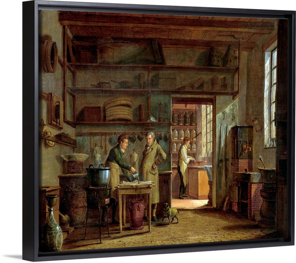 <p>Interior of the Laboratory of the Apothecary, by Johannes Jelgerhuis, 1818, Dutch painting, oil on canvas. An man is mixing a drug, for a waiting customer. Through the doorway a man is working at the scales. This drug laboratory was owned by pharmacist, Anthony d' Ailly.</p>