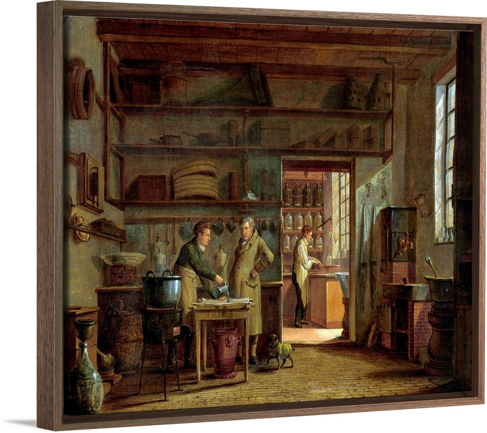 <p>Interior of the Laboratory of the Apothecary, by Johannes Jelgerhuis, 1818, Dutch painting, oil on canvas. An man is mixing a drug, for a waiting customer. Through the doorway a man is working at the scales. This drug laboratory was owned by pharmacist, Anthony d' Ailly.</p>