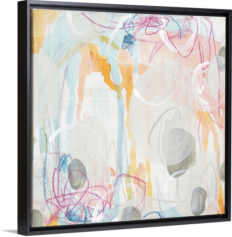 <p>Square abstract painting in light pastel colors with drips of the overlapping paint and colored scribbles.</p>