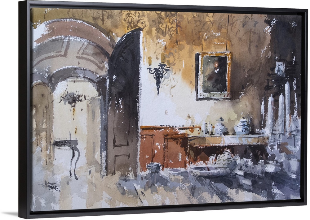 <p>This contemporary artwork features dry watercolor brush stokes to illustrate an interior view that is a mixture of realism and abstraction.</p>
