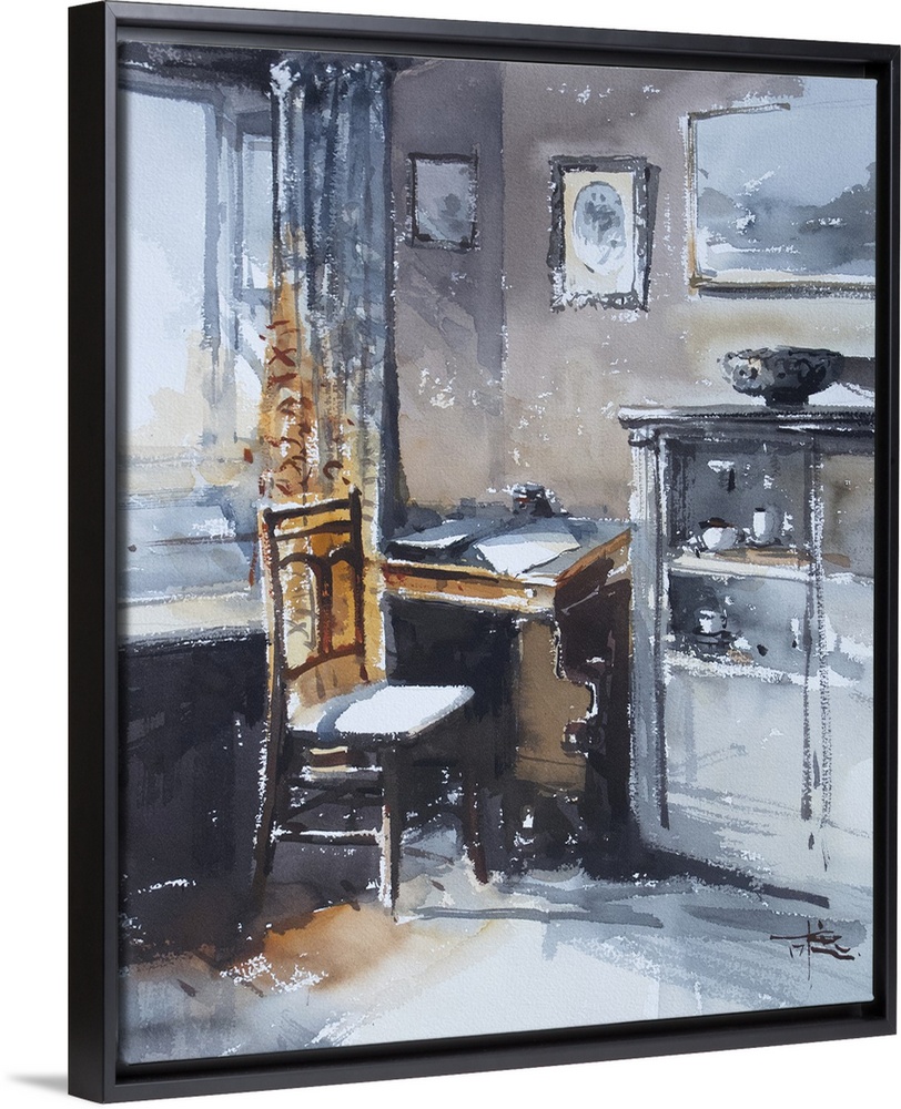 <p>This contemporary artwork features dry watercolor brush stokes to illustrate an antique office space.</p>