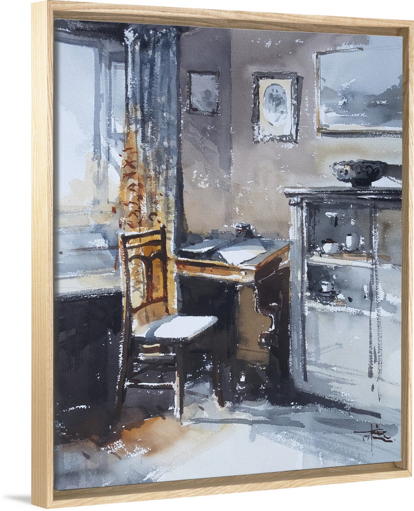 <p>This contemporary artwork features dry watercolor brush stokes to illustrate an antique office space.</p>