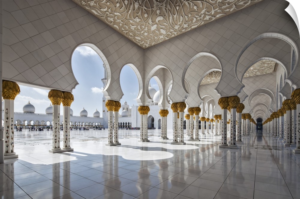 <p>Internal view of the arcade of the Sheikh Zayed Mosque, Al Maqta district of Abu Dhabi, Abu Dhabi, United Arab Emirates.</p>
