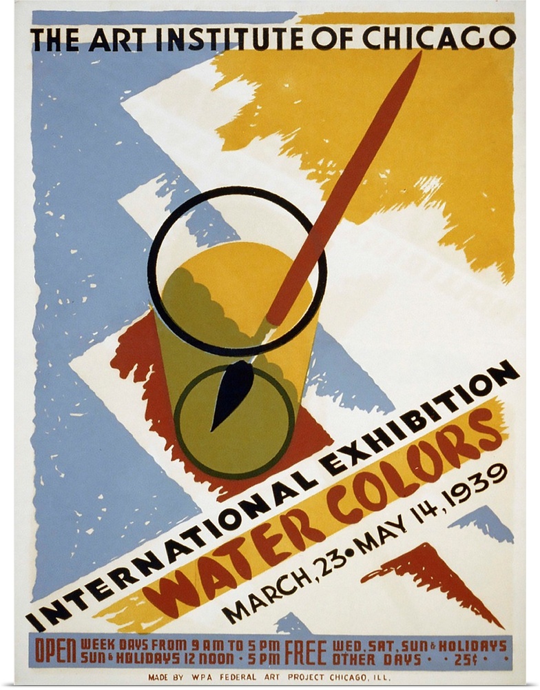 <p>International Exhibition of Water Colorsm The Art Institute of Chicago. March 23 - May 14 1939. Poster for exhibit of watercolors at the Art Institute of Chicago, showing a paintbrush in a glass of water. Library of Congress, Prints and Photographs Division, WPA Poster Collection.</p>