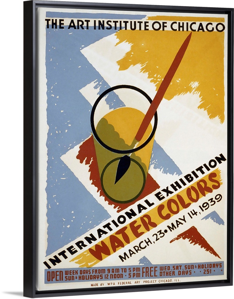 <p>International Exhibition of Water Colorsm The Art Institute of Chicago. March 23 - May 14 1939. Poster for exhibit of watercolors at the Art Institute of Chicago, showing a paintbrush in a glass of water. Library of Congress, Prints and Photographs Division, WPA Poster Collection.</p>