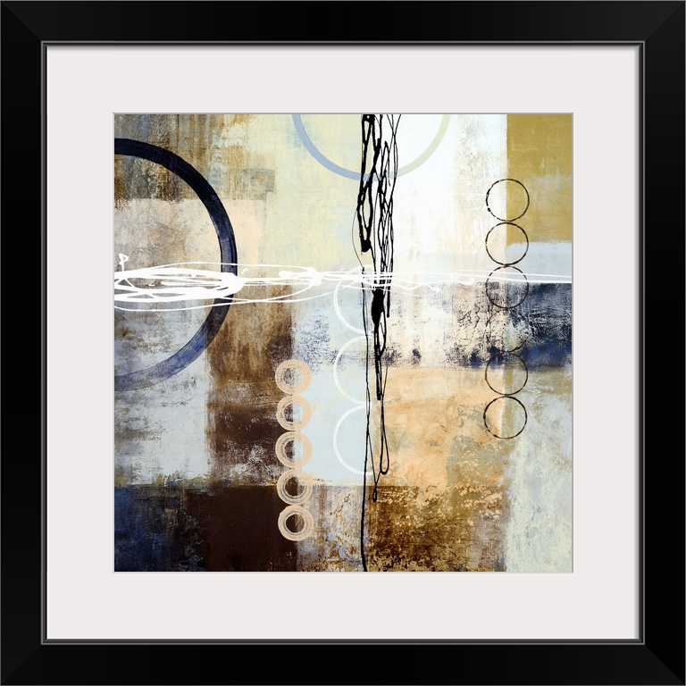 <p>A piece of abstract artwork that has blocks of colors as the base with different size circles laid over top and black and white streaks on top of that.</p>
