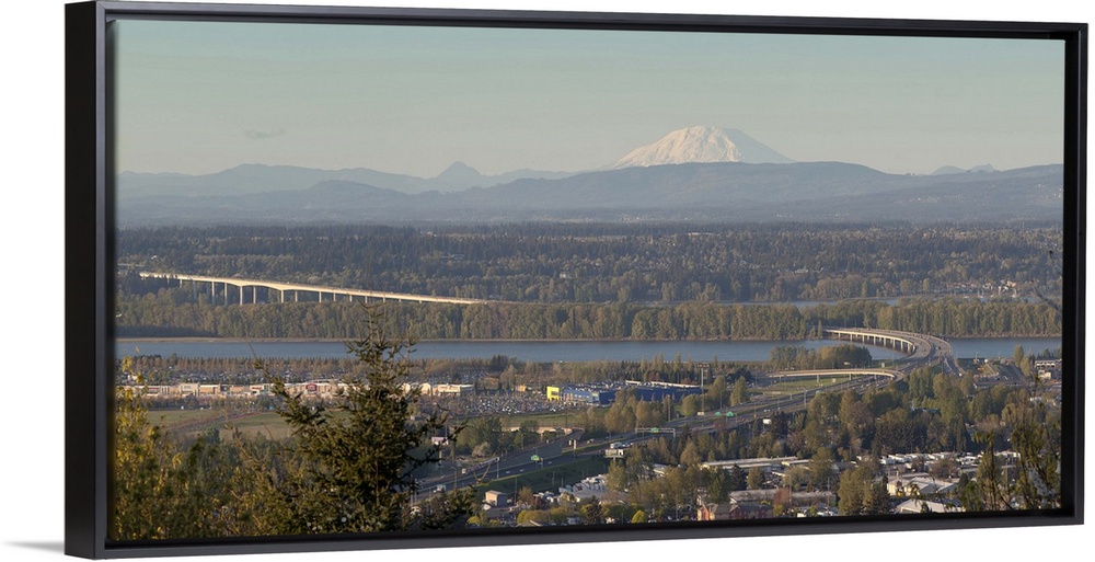 <p>Elevated view of Interstate 205 Bridge over Columbia River with Mount St. Helens and business plaza, Portland, Oregon, USA.</p>