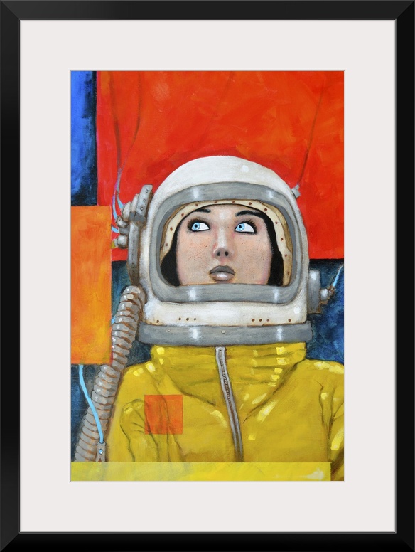<p>Illustration of a woman wearing a retro space suit in primary colors.</p>