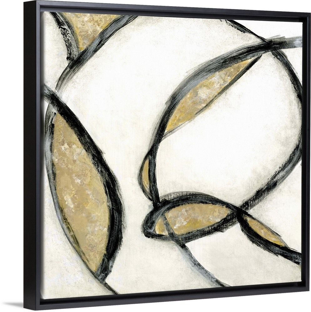 <p>Abstract contemporary painting in swirling black strokes with gold and beige.</p>
