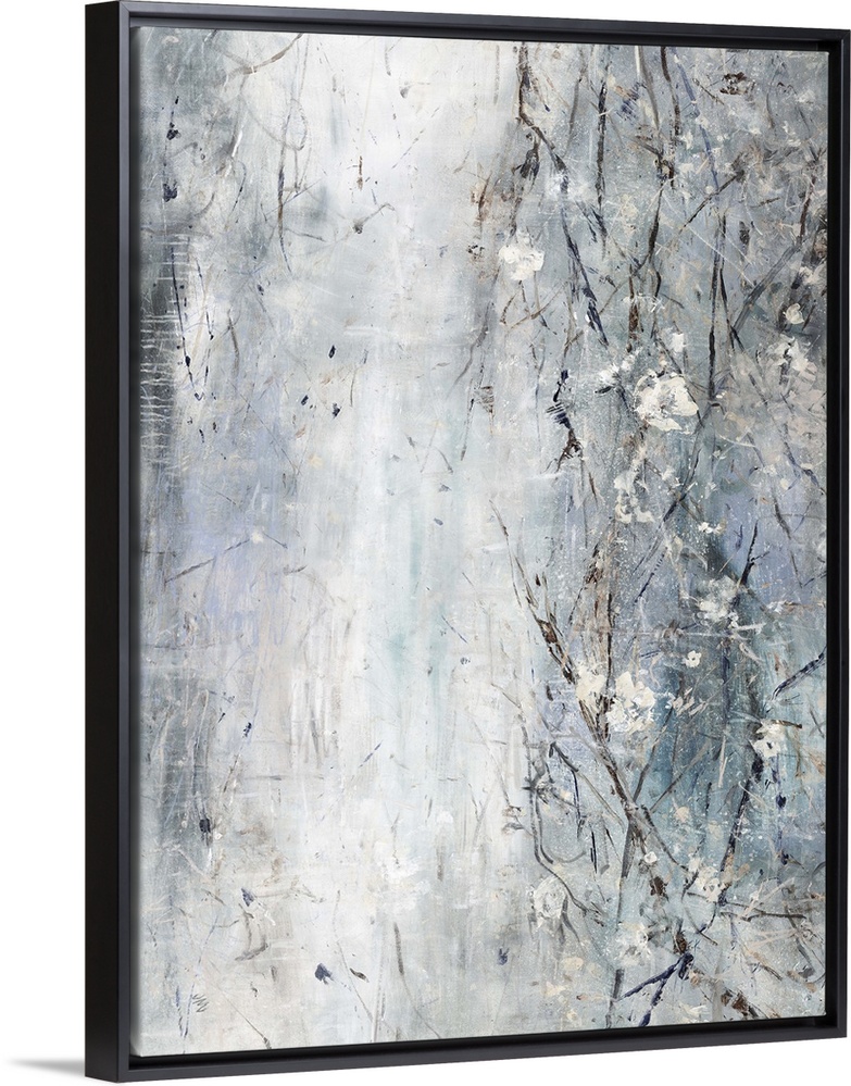 <p>Contemporary abstract painting with vines of flowers on the running vertically on the right side of the canvas in shades of blue, gray, brown, and white.</p>