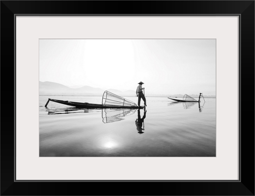 <p>Intha 'leg rowing' fishermen at dawn on Inle Lake, Myanmar.</p>