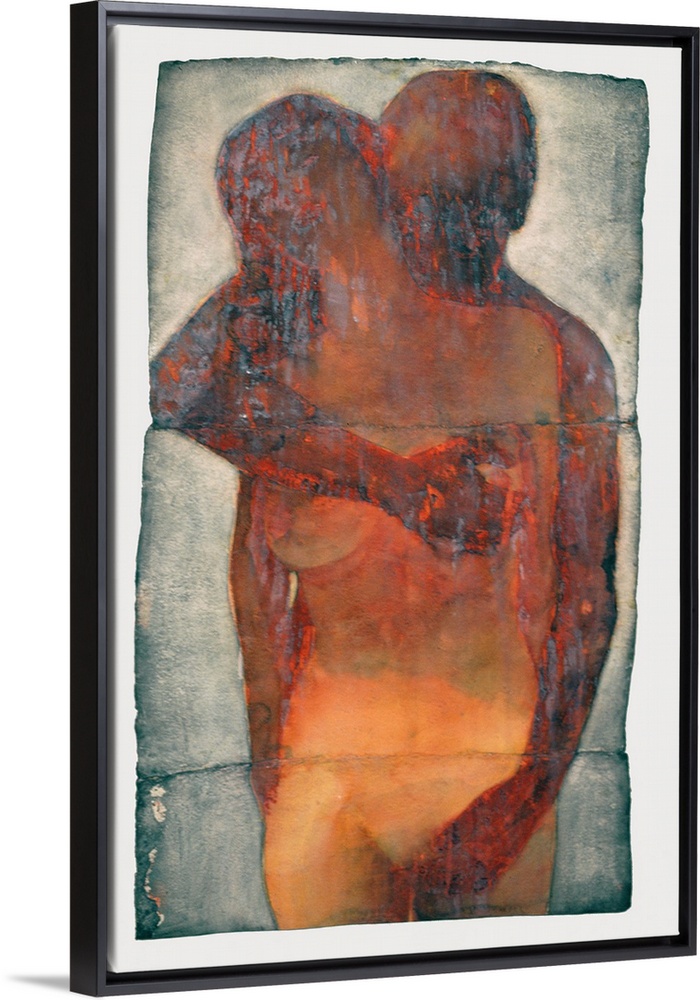 <p>Large, portrait artwork of a man intimately embracing a nude woman from behind, as she faces forward. Shapes are implied, as the image has minimal detail, the outer edge is a rough, uneven border surrounded by a neutral color.</p>