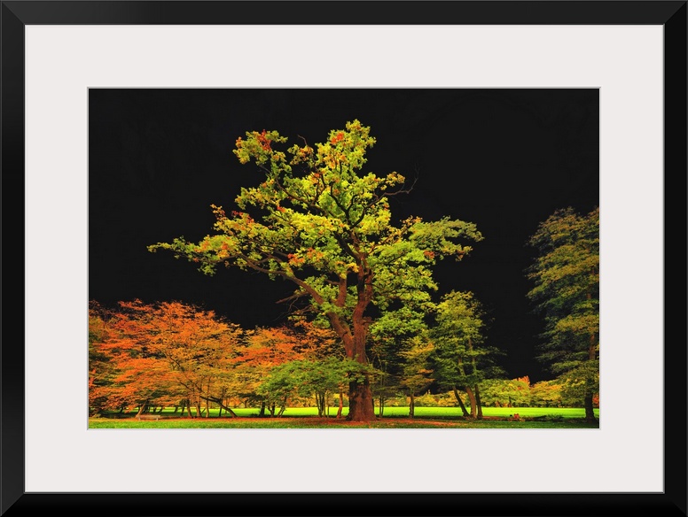 <p>Autumn trees in a field standing out brightly in font of a black sky.</p>