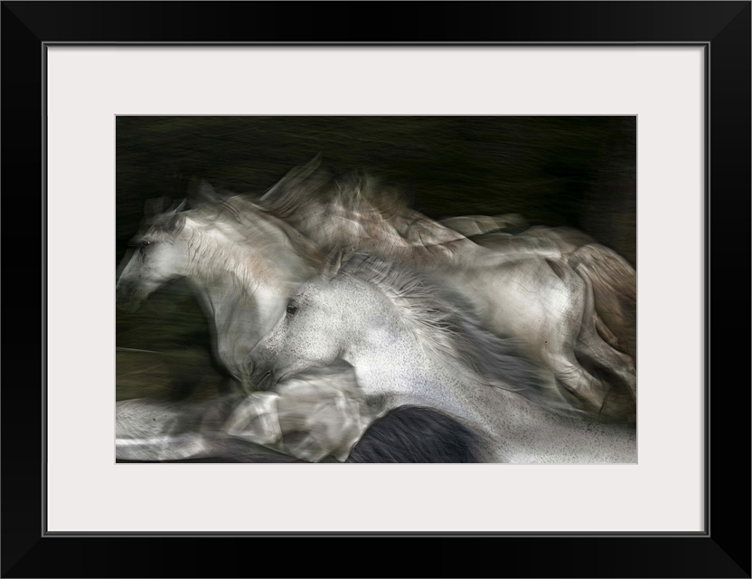 <p>Blurred motion image of a herd of white horses galloping in a field.</p>