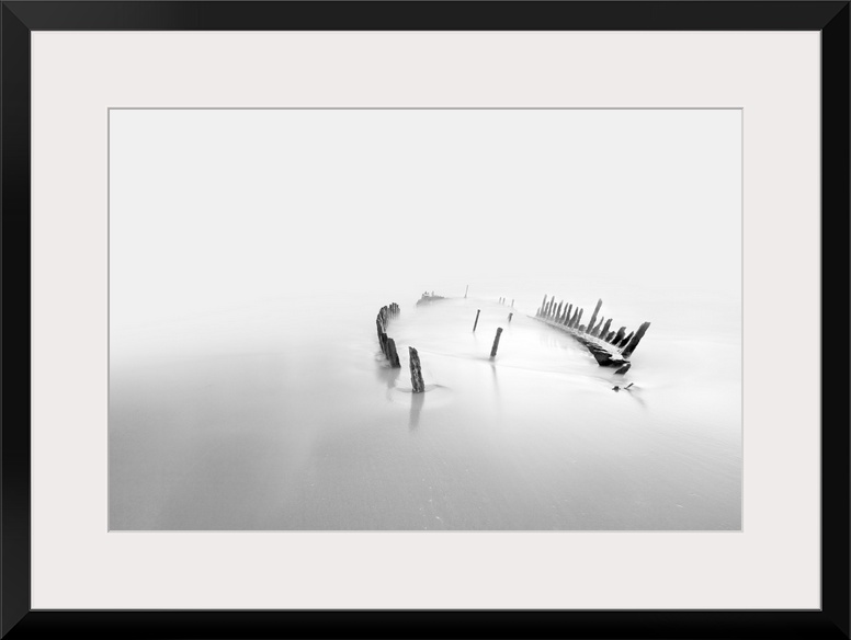 <p>The remains of a ship submerged in the water on a beach.</p>