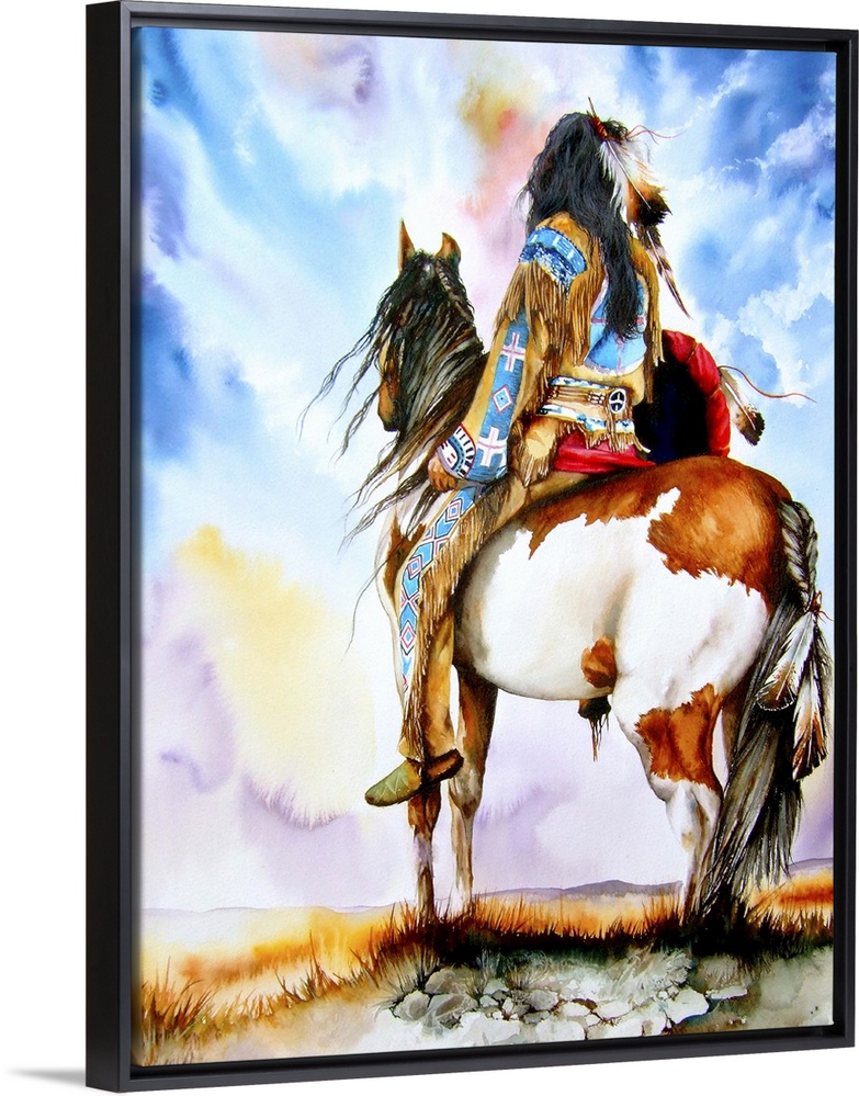 <p>A warrior pauses aboard his pinto pony to survey the country ahead.</p>