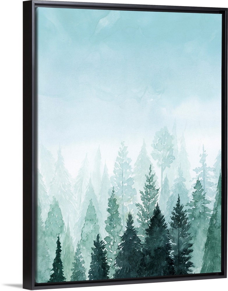 <p>Watercolor painting of a misty forest under a pale blue sky.</p>