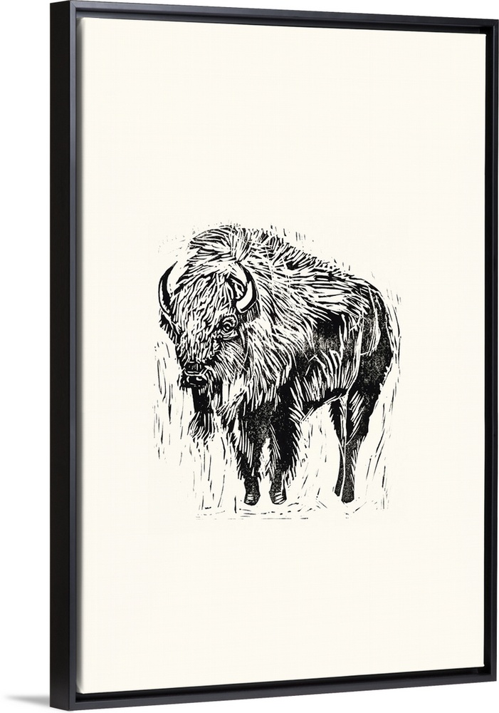 <p>Black and white block print illustration of a bison on an off white background.</p>