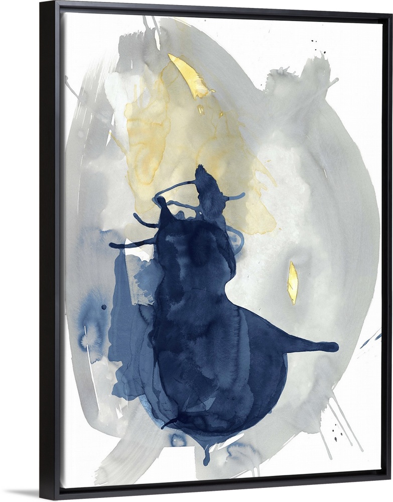 <p>Large abstract watercolor painting in grey, blue, and yellow hues on a white background.</p>