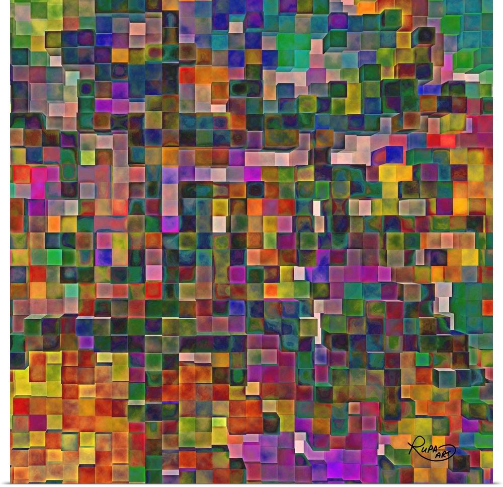 <p>Square abstract art that is made up with tiny squares filled with color creating a grid-like pattern.</p>