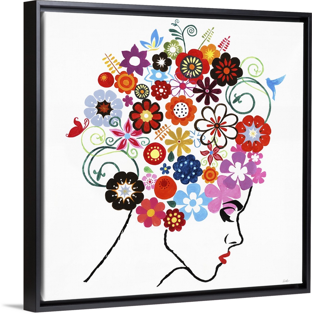 <p>Square artwork with a woman outlined in black with red lips and hair made out of colorful flowers, all on a white background.</p>
