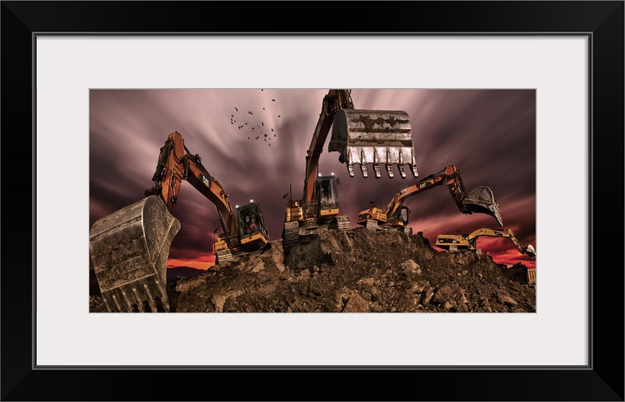 <p>Four excavators digging in a pile of dirt, with a cloudy sky above.</p>
