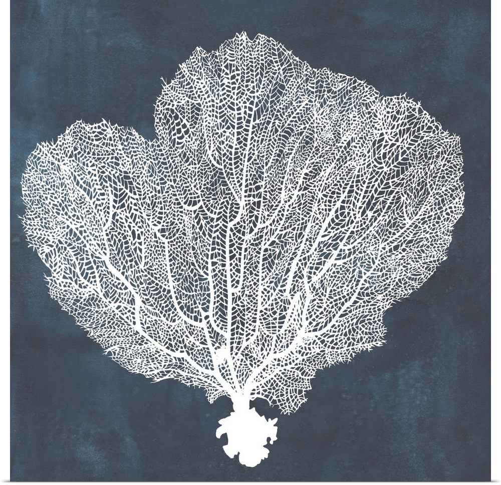 <p>Contemporary nautical themed artwork of a sea fan in white against a dark navy blue background.</p>