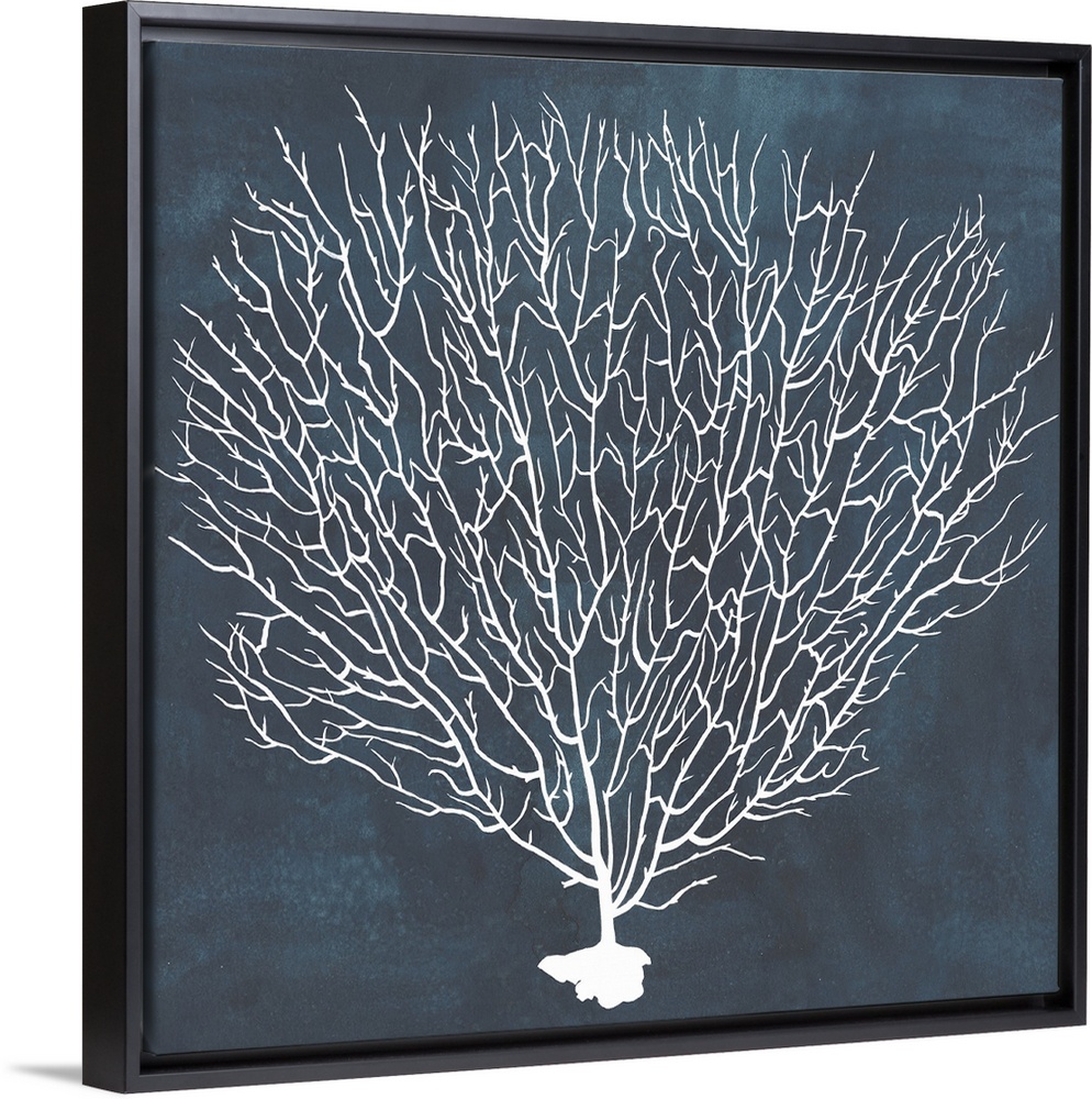 <p>Contemporary nautical themed artwork of a sea fan in white against a dark navy blue background.</p>