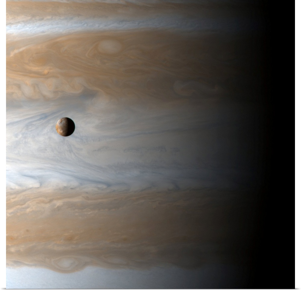<p>Io and Jupiter, Cassini image. Io, the round object at left, is one of the largest of the moons of Jupiter. Clouds in Jupiter's atmosphere form the backdrop to this image. Io has a diameter of 3642 kilometres, but Jupiter, the solar system's largest planet, dwarfs its moon, with a diameter of 142,984 kilometres. Io is the innermost of the four Galilean moons, orbiting Jupiter at a distance of 350,000 kilometres from its cloudtops. Image obtained on 1 January 2001 by Cassini's Imaging Science Subsystem (ISS). Courtesy of NASA, JPL, UNIVERSITY OF ARIZONA.</p>