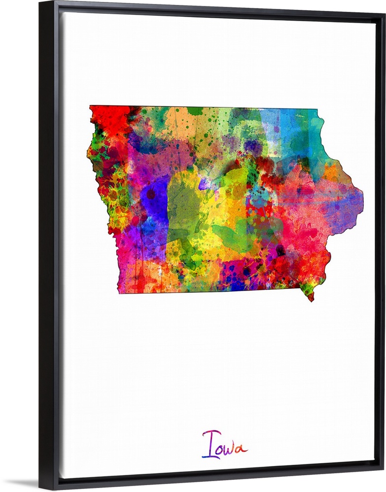 <p>Contemporary artwork of a map of Iowa made of colorful paint splashes.</p>
