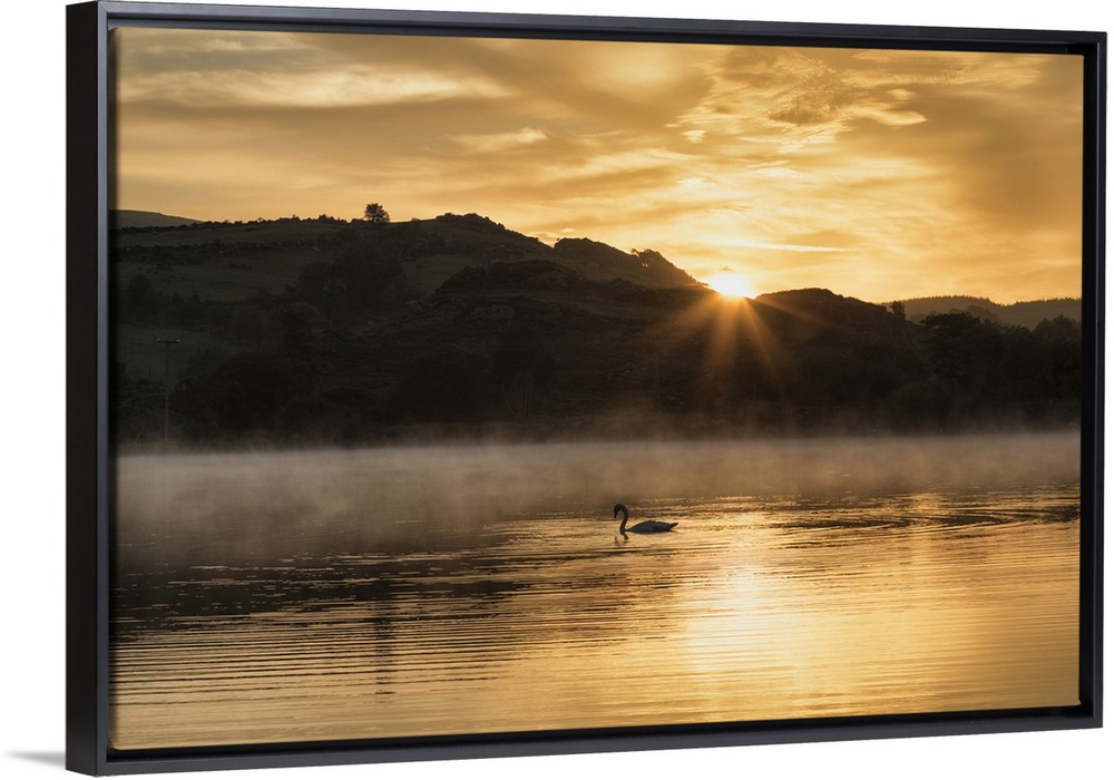 <p>Swan in fog and sunrise at Gougane Barra, Cork, Ireland .</p>