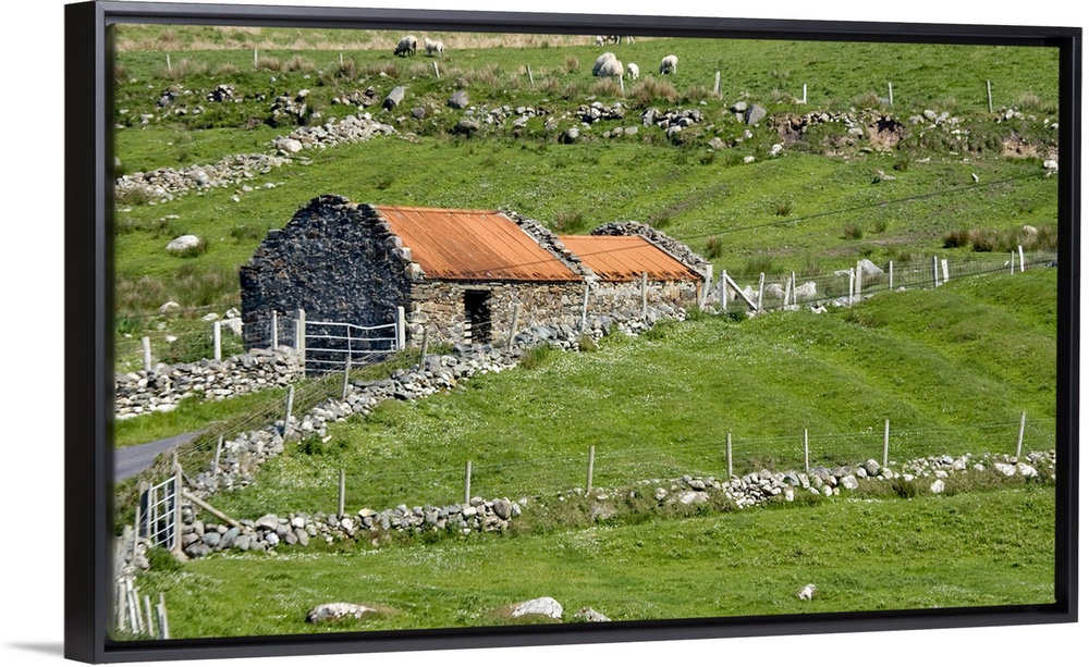 <p>Europe, Ireland, County Mayo, Barnabaun Point. Irish countryside with stone wall and red-roofed house. Credit as: Wendy Kaveney / Jaynes Gallery / DanitaDelimont.com.</p>