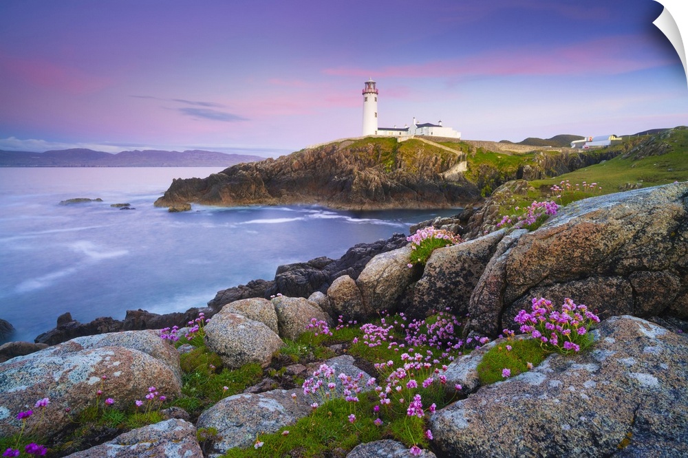 <p>Ireland, Co. Donegal, Fanad, Fanad lighthouse with Sea thrift in foreground at dusk.</p>
