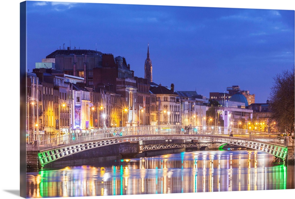 Ireland, Dublin, Hapenny Bridge over the River Liffey, dusk