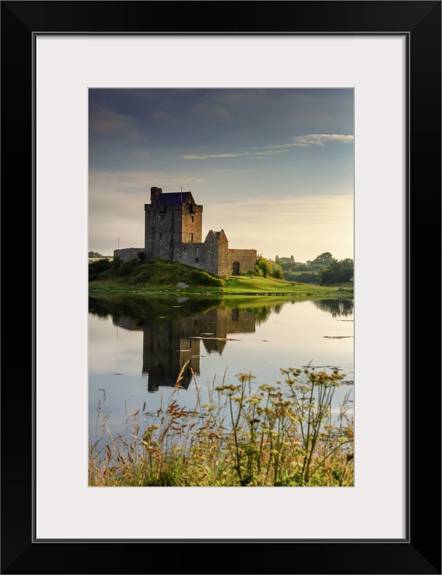 <p>Europe, Ireland, Dunguaire castle at sunrise in Kinvara village reflecting in the Atlantic Ocean</p>