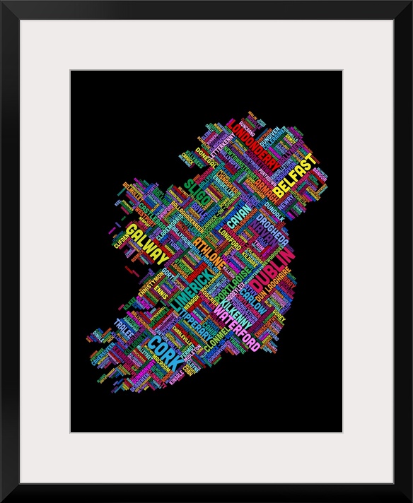 <p>Contemporary piece of artwork of a map of Ireland made up of the names of text.</p>