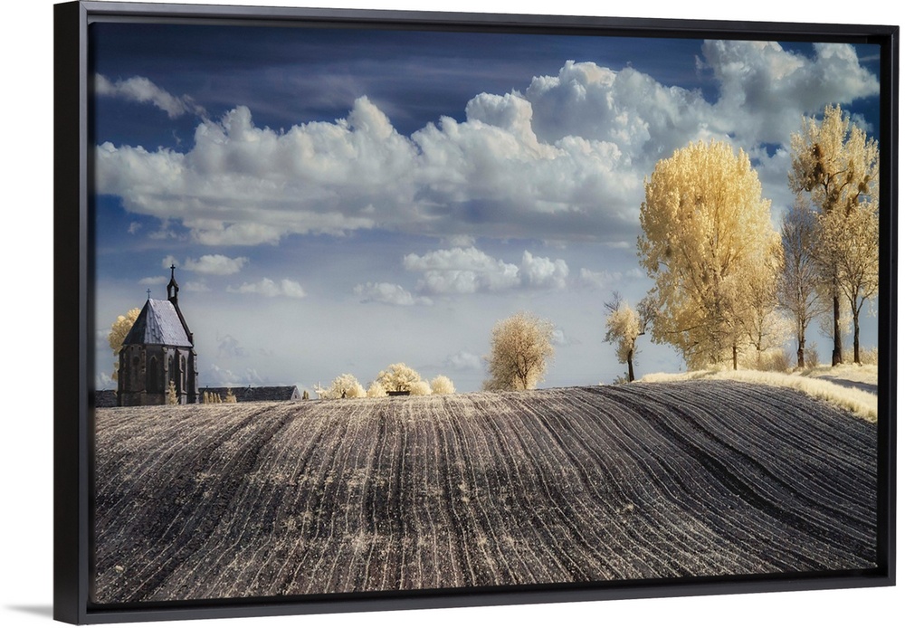 <p>Infrared image of a tilled field in the countryside in Poland, with a church and trees.</p>