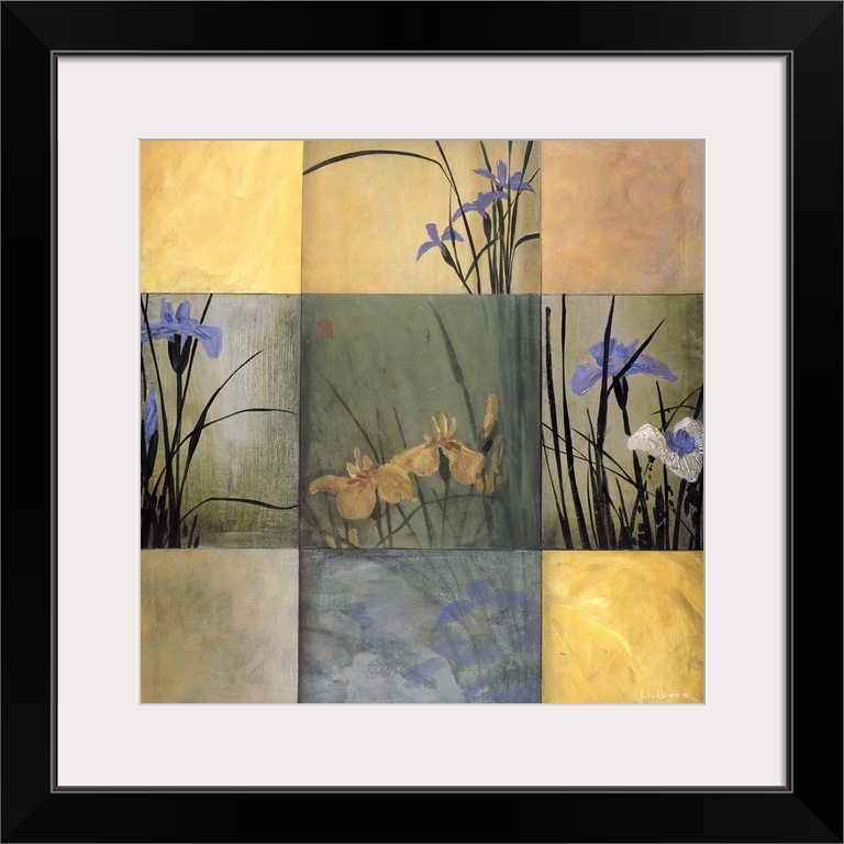 <p>A contemporary painting of irises in a nine square grid design.</p>